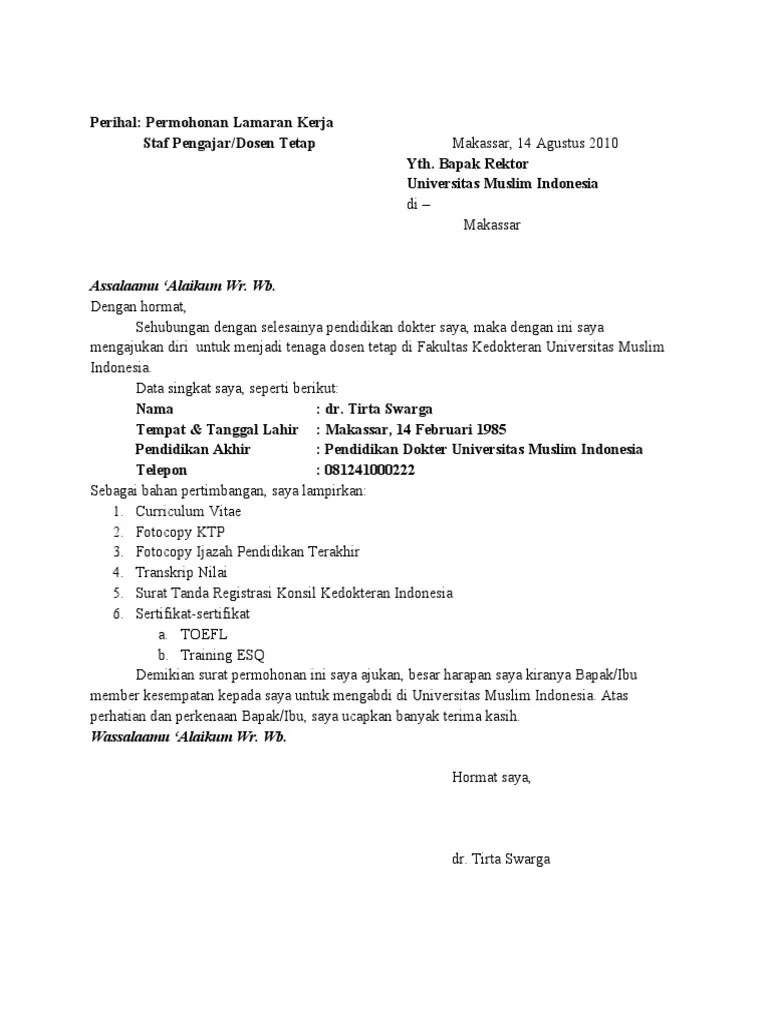 Disini akan diberikan contoh surat lamaran kerja dosen dengan menggunakan bahasa indonesia yang baik dan benar untuk melamar profesi sebagai . Contoh surat lamaran dosen : Ini juga menjadi kualifikasi lain untuk menjadi dosen, yaitu harus menguasai bahasa inggris. Contoh surat lamaran kerja dosen perguruan tinggi · daftar riwayat hidup, · fotokopi ijazah s2 pendidikan bidan yang dilegalisir, · transkrip nilai s2 pendidikan . Bermaksud mengajukan diri untuk bergabung dalam pekerjaan sebagai dosen mata kuliah bahasa inggris di universitas yang bapak/ibu pimpin.